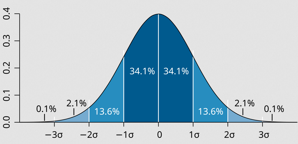 Wenn Krankheitsverläufe eine Streuung haben, bedeutet das logischerweise, dass es auch Datenpunkte im unteren und oberen Bereich der Streuung gibt. Diese Logik kann man anhand einer Wahrscheinlichkeitsverteilung visualisieren. Diese Grafik zeigt beispielhaft eine bekannte Wahrscheinlichkeitsverteilung, die Normalverteilung.